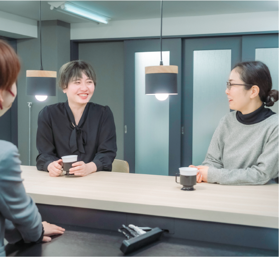 業務中はそれぞれパソコンに向かって作業をしていますが、ひと休みしたいときはカフェスペースのカウンターでコーヒーを飲んだり、yogiboでリラックスしたりと、休憩スペースで思い思いに過ごしています。休憩スペースには「カプセルトイ」まであって、カプセルの中にいろいろなお菓子が入っているんです。今日はどのお菓子を取ろうかと、同僚と盛り上がっています。